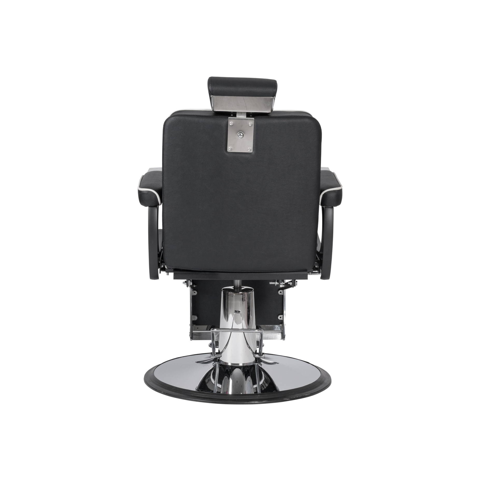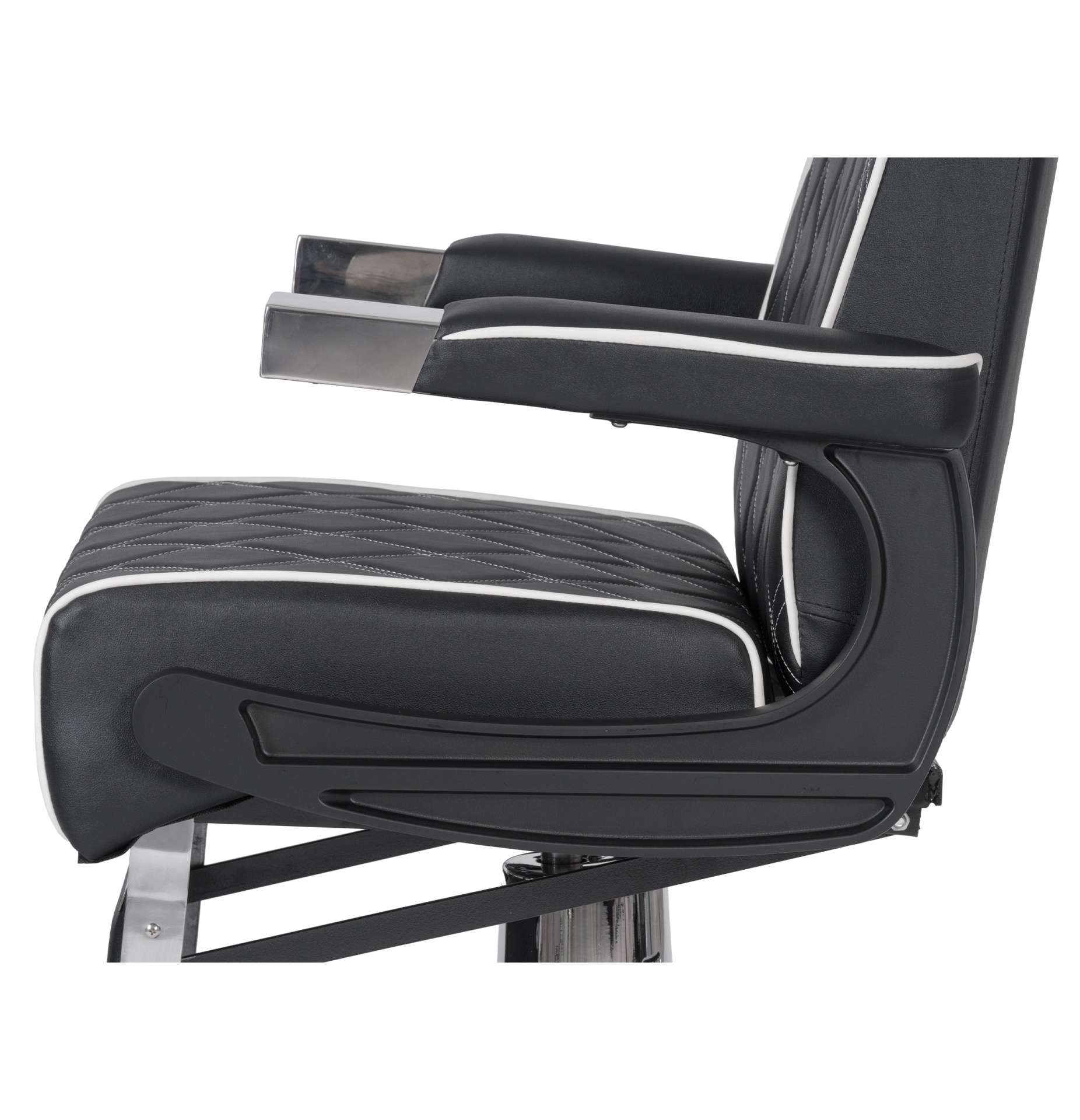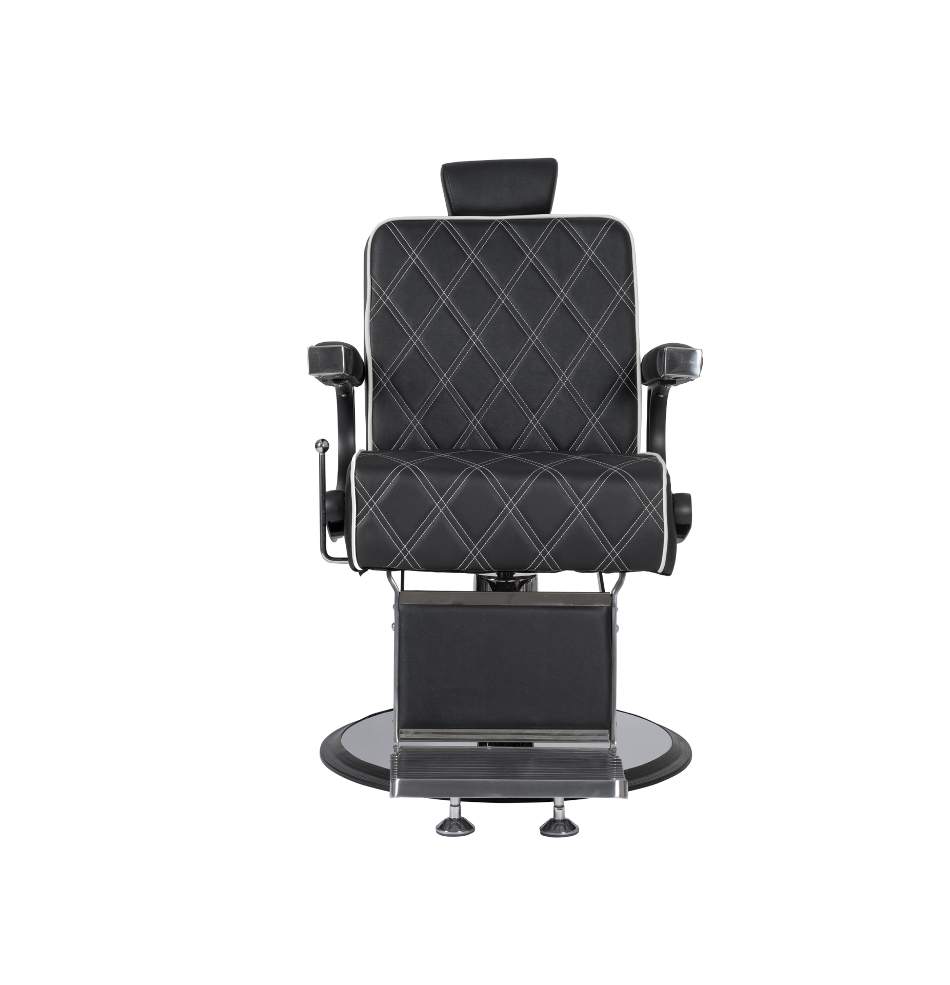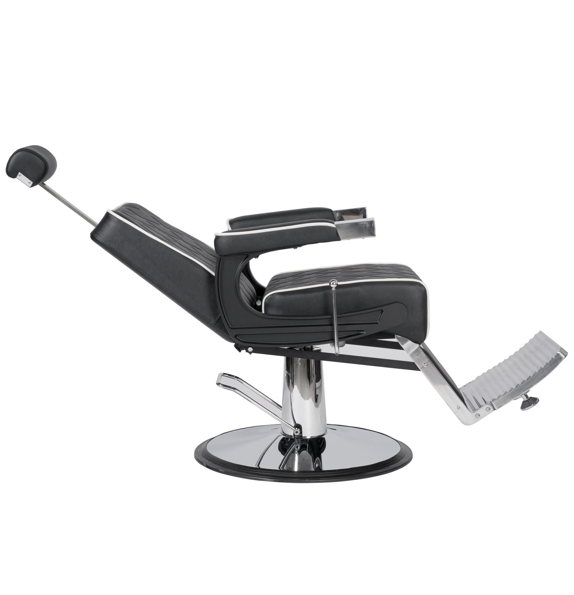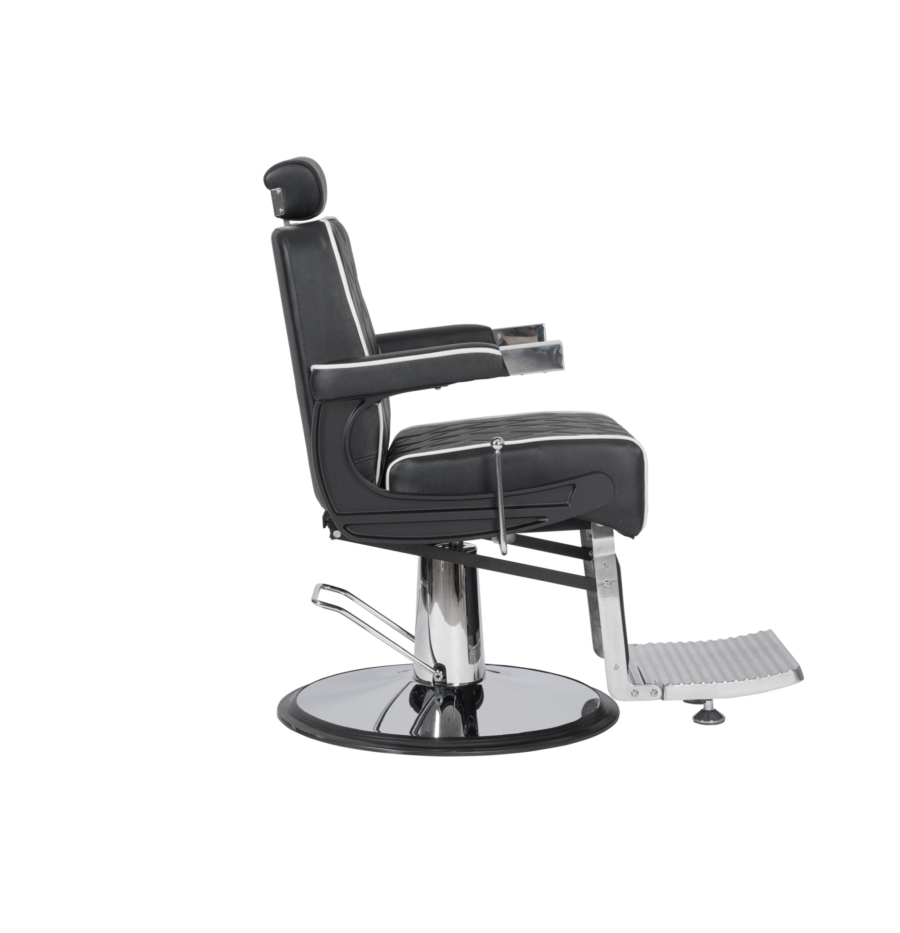 Cadeira de barbeiro elegante com um chassi feito de alumínio moldado por injeção e estruttura interna resistente. Equipado com uma base redonda cromada e um assento com espuma de alta densidade e molas para maior conforto e durabilidade. Estofamento com costura branca.