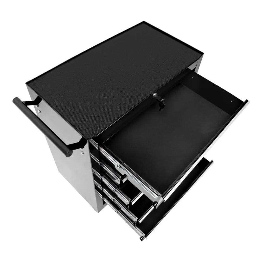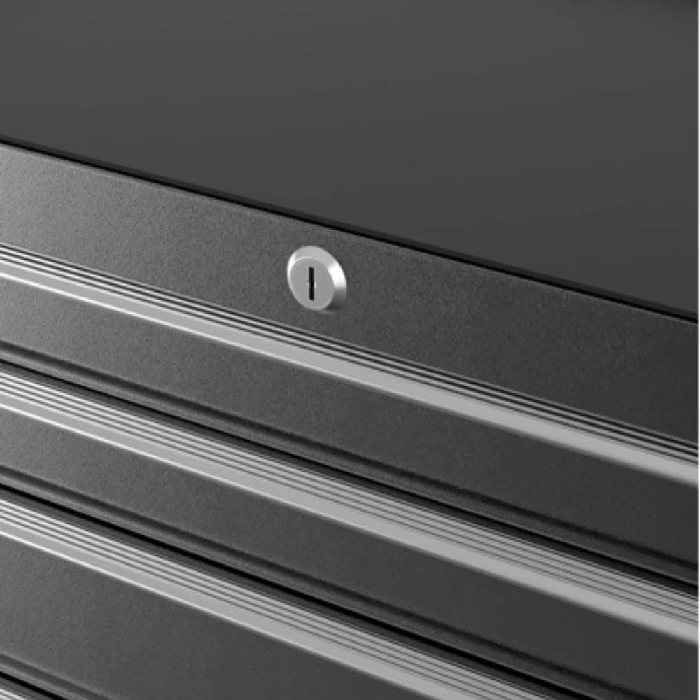 O carrinho ainda possui sistema de fecho com chave e barras de segurança, garantindo proteção extra, enquanto os tapetes antiderrapantes no tampo e nas gavetas mantêm as ferramentas estáveis e protegidas.