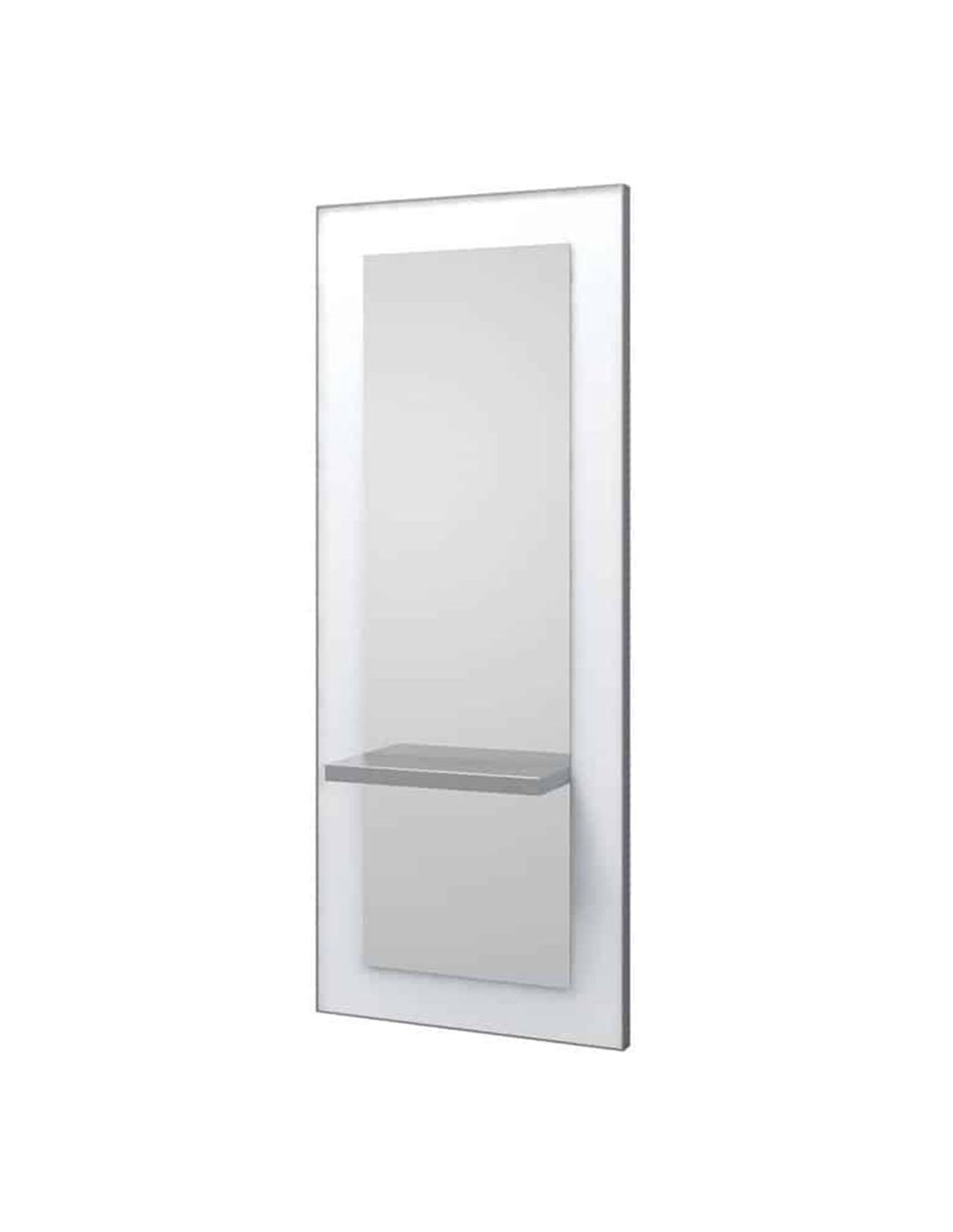 Espelho com borda polida com prateleira e estrutura em aço inoxidável.