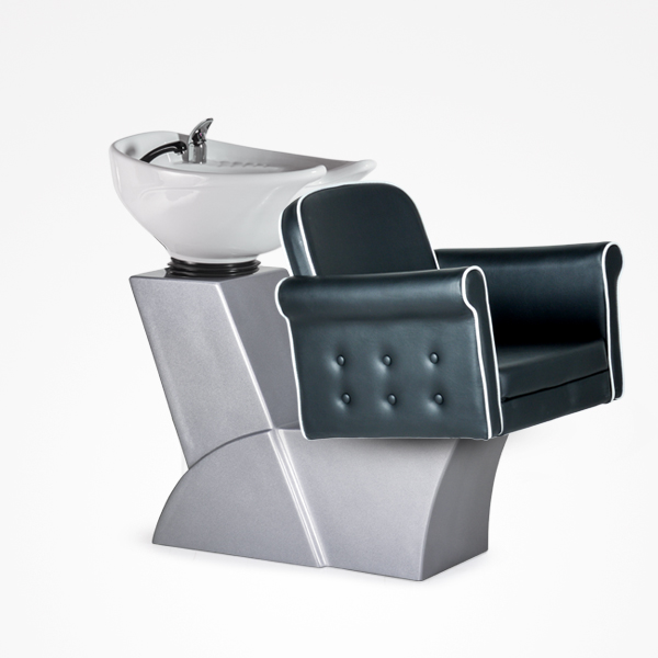 Rampa de lavagem profissional Casey Perth, com bacia de cerâmica reclinável em branco e torneiras de alavanca única italiana. Poltrona estofada em preto, com rebordo em branco.