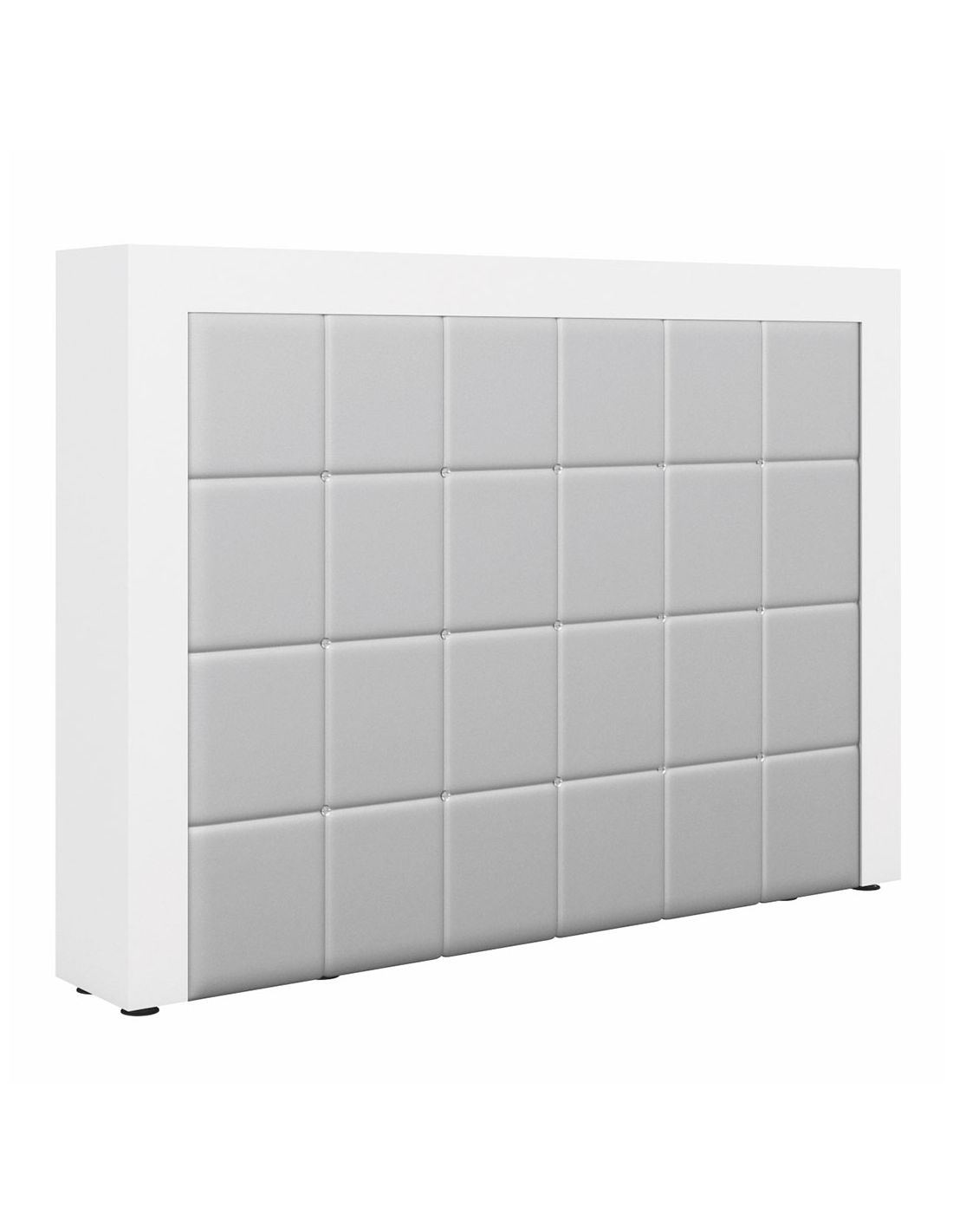 Balcão de recepção Crystal com aro frontal lacado a branco standard e painel frontal forrado com costuras.