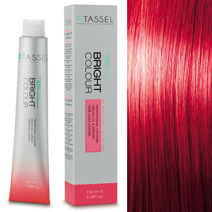 Tubo e caixa de tinta para cabelo TASSEL Bright Colour ao lado de amostra de cabelo vermelho vibrante.
